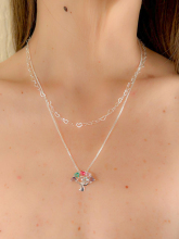 Colar Duplo Árvore da Vida com Zircônias Coloridas - O colar árvore da vida com zircônias em formato de coração é formado por dois colares, um menor de mini corações e uma veneziana maior com um pigente de árvore da vida cravejado de zirconias coloridas em formato de coração. A Árvore da vida também é conhecida como árvore da família, o que também faz muito sentido. Isso porque a árvore tem uma raiz consolidada formando uma base sólida, um tronco que unifica e vários galhos que formam as ramificações. Portanto, a árvore é uma metáfora perfeita para a vida familiar. Encantador e moderno com um símbolo que representa gerações . Pode ser usado no dia a dia e com qualquer composição de look , detalhes nas folhinhas com zircônias coloridas em formato de coração que dão um lindo charme a esse colar duplo .